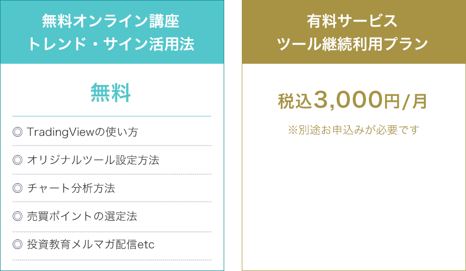 実際に、無料ツール(トレンドサイン)をお試しください。 ツールのご登録から30日間は何度でもご利用いただけます。 無料期間が過ぎて、継続的なご利用をご希望の場合は「継続プラン」へのお申込みをご検討ください。 ※継続プランは税込3,000円/月で、いつでも利用停止できます。 ※成果には個人差があり、成果を保証するものではありません。