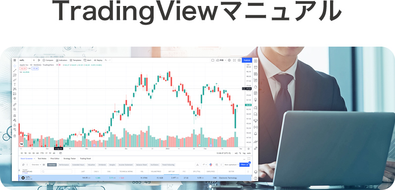 ● TradingViewとは? TradingViewは米国シカゴに本社を置くTradingView Inc.が開発している高機能チャートです。世界で1,500万人(※)のトレーダーが愛用しており、日本でも多くの投資家が利用しています。SNS上でTradingViewを高評価している有名トレーダーも少なくありません。 ● TradingViewとツールの利用方法 ツールをご利用いただくにはTradingViewのアカウントが必要になりますが、アカウントの作成方法からツールの利用手順まで、丁寧にマニュアルにしてお渡しするのでご安心ください。 ※TradingViewには有料プランがありますが、当講座では無料版のままご利用いただけます。