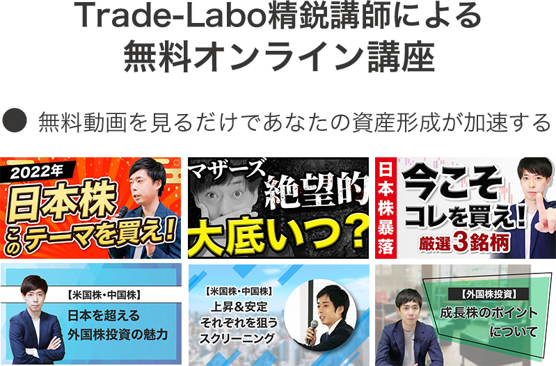 Q.投資は初心者ですが大丈夫でしょうか? A.はい、大丈夫です。当講座は投資未経験の方でもわかるように丁寧に解説しています。また、売買でお金を守りながら運用する手順もお伝えするので、安心してお試しください。 Q.ツールは30日を過ぎると自動的に有料になるのでしょうか? A.自動的に有料になることはございません。継続的なご利用をご希望の場合は「継続プラン」へのお申込み方法をメールでご案内させていただきますので、その際にお申込みをご検討ください。 Q.TradingViewで売買はできますか? A.TradingViewはチャート分析を行うためのツールとなり、実際に売買を行うには各証券会社で別途口座の開設が必要になります。当講座ではどの証券会社でもご利用いただけるので、すでにお持ちの口座があればそちらをご利用いただけます。 Q.TradingView以外のツールでも使えますか? A.TradingView専用で開発したオリジナルのチャート分析ツールとなるため、他のツールでは使用できません。なお、TradingViewは無料版でツールを使用できます。 Q.メールアドレスを登録したのですが、返信メールが届きません。 A.携帯アドレス(au,softbank,docomo,icloudなど)は、当社からのメールが届かない場合があります。ご登録は「gmail」または「Yahoo」アドレスをおすすめします。また、gmail、Yahooメールであっても「迷惑メールフォルダ」に入ってしまう可能性があります。メールが届いていない場合は「迷惑メールフォルダ」もあわせてご確認ください。携帯アドレスをお使いの方は【info@trade-labo.jp】からのメールの受信設定をONにした上で、お手数をおかけいたしますが再度ご登録をお試しください。 Q.パソコンを持っていません。スマホだけでもできますか? A.ツールはスマホでもご利用いただけます。ただ、当講座でお渡しする動画及びマニュアルはパソコン画面をもとに解説しており、スマホ画面とボタンの配置などが異なっている可能性があります点、あらかじめご了承ください。もし今後、投資を継続的に学ぶおつもりでしたら、パソコンがあるとより理解が深まりやすいので購入をおすすめします。 Q.無料講座の視聴期限はありますか? A.視聴期限はございませんので、ご自身のペースでご覧ください。また、当オンライン講座はパソコン・スマホどちらからでも視聴いただけますので、好きな場所でご覧いただけます。